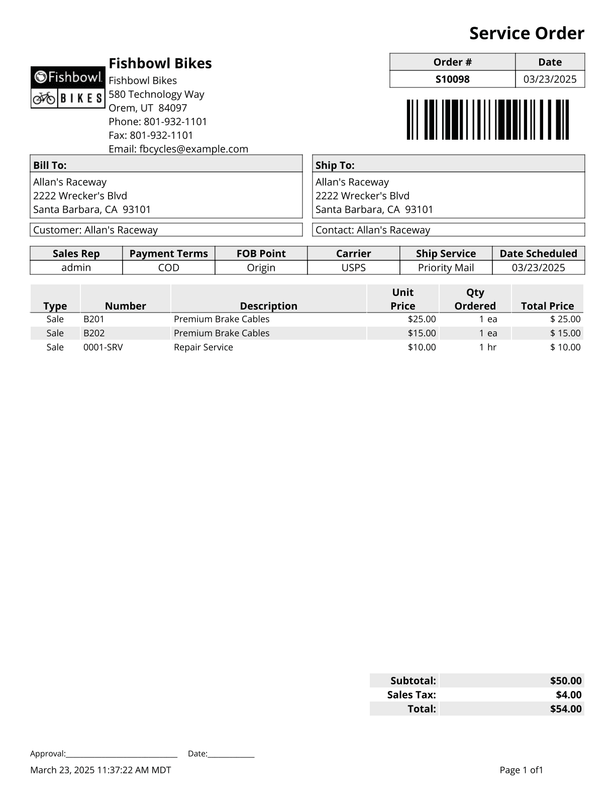 Service Order - Service Order Report shows sales order information with a section for service parts used on the order.