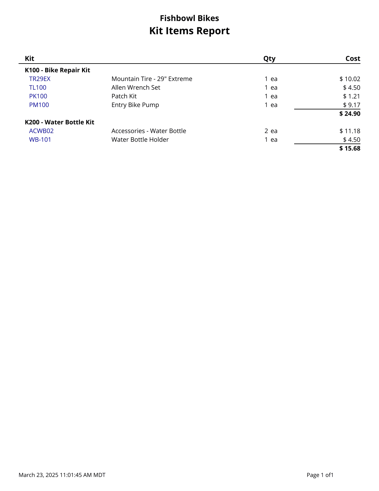 Kit Report - Displays list of kits and items within. Cost values are based on today's costs. Starred (*) items are the default of an optional or variable-optional item. Items that are not default do not display quantity or cost.