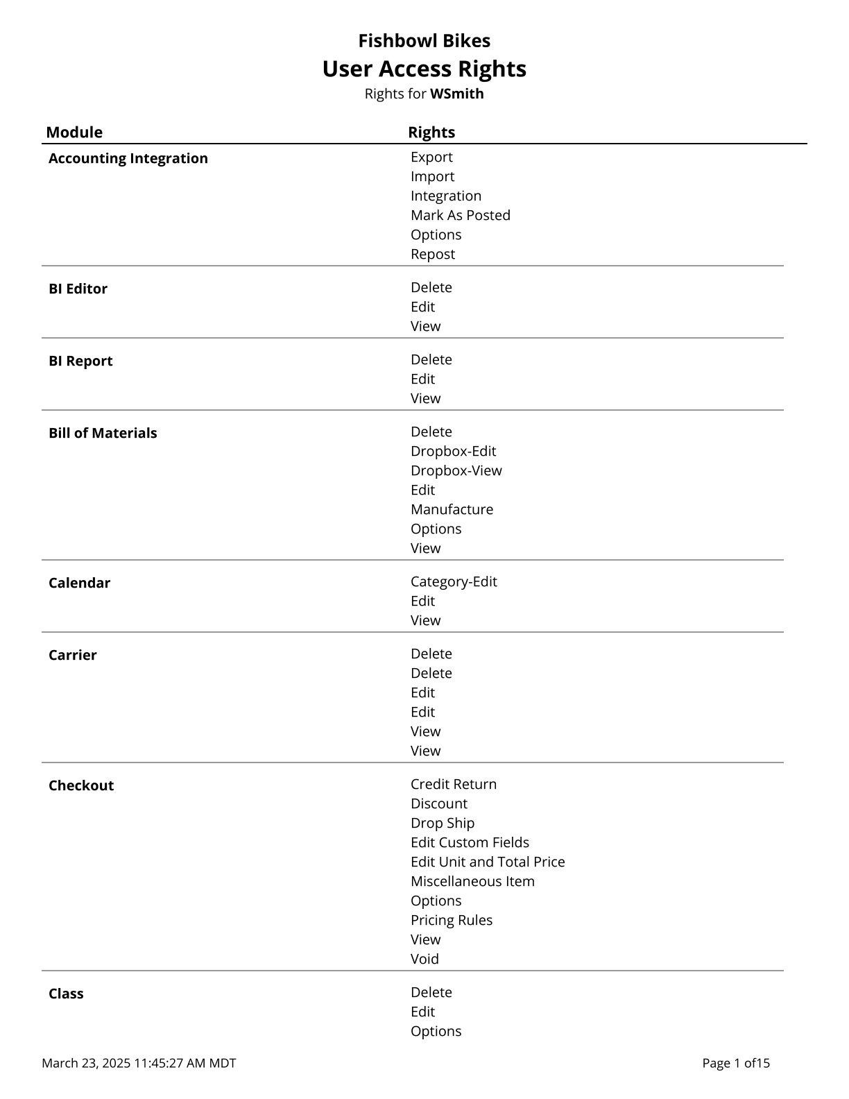 User Access Rights - List of access rights for a specified user.