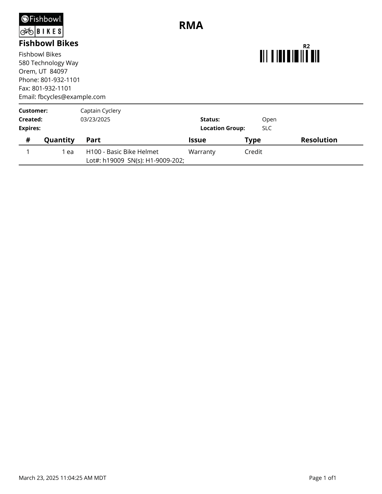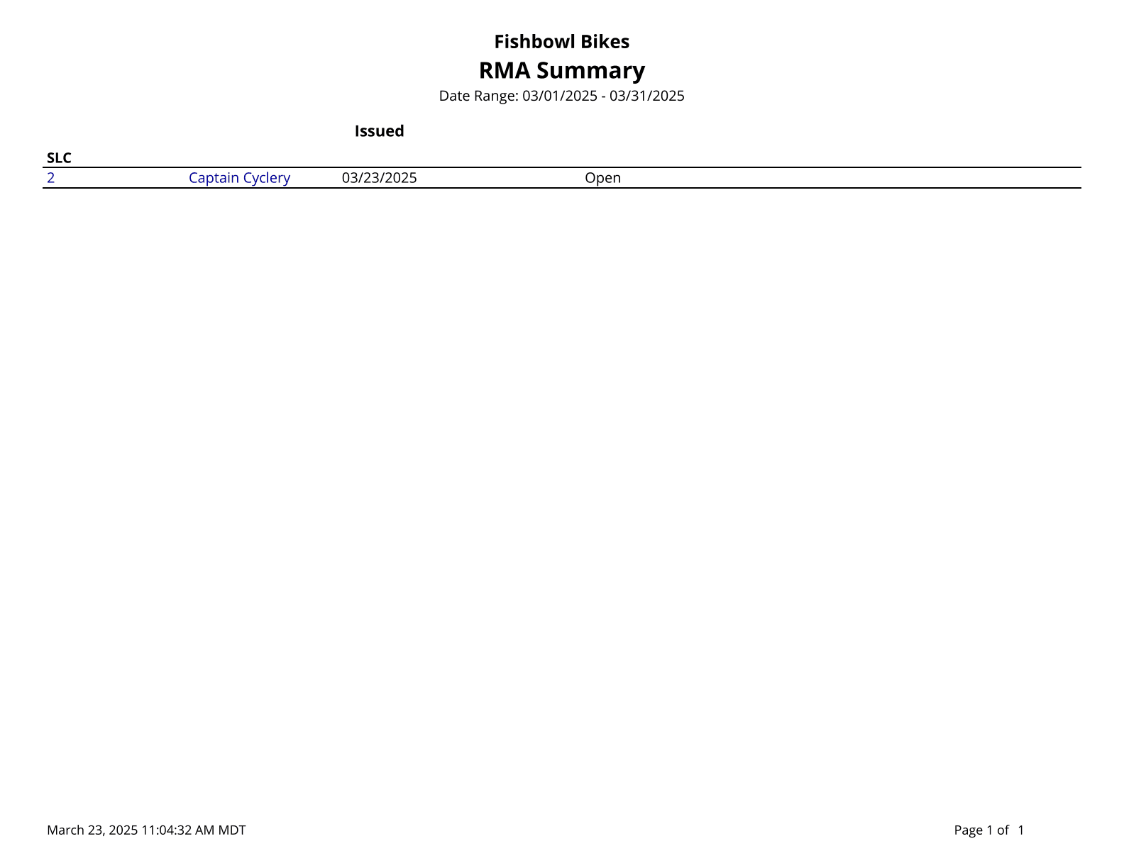 RMA Summary - Prints a summary of RMAs issued during the time window given; no taxes or shipping fees are included.