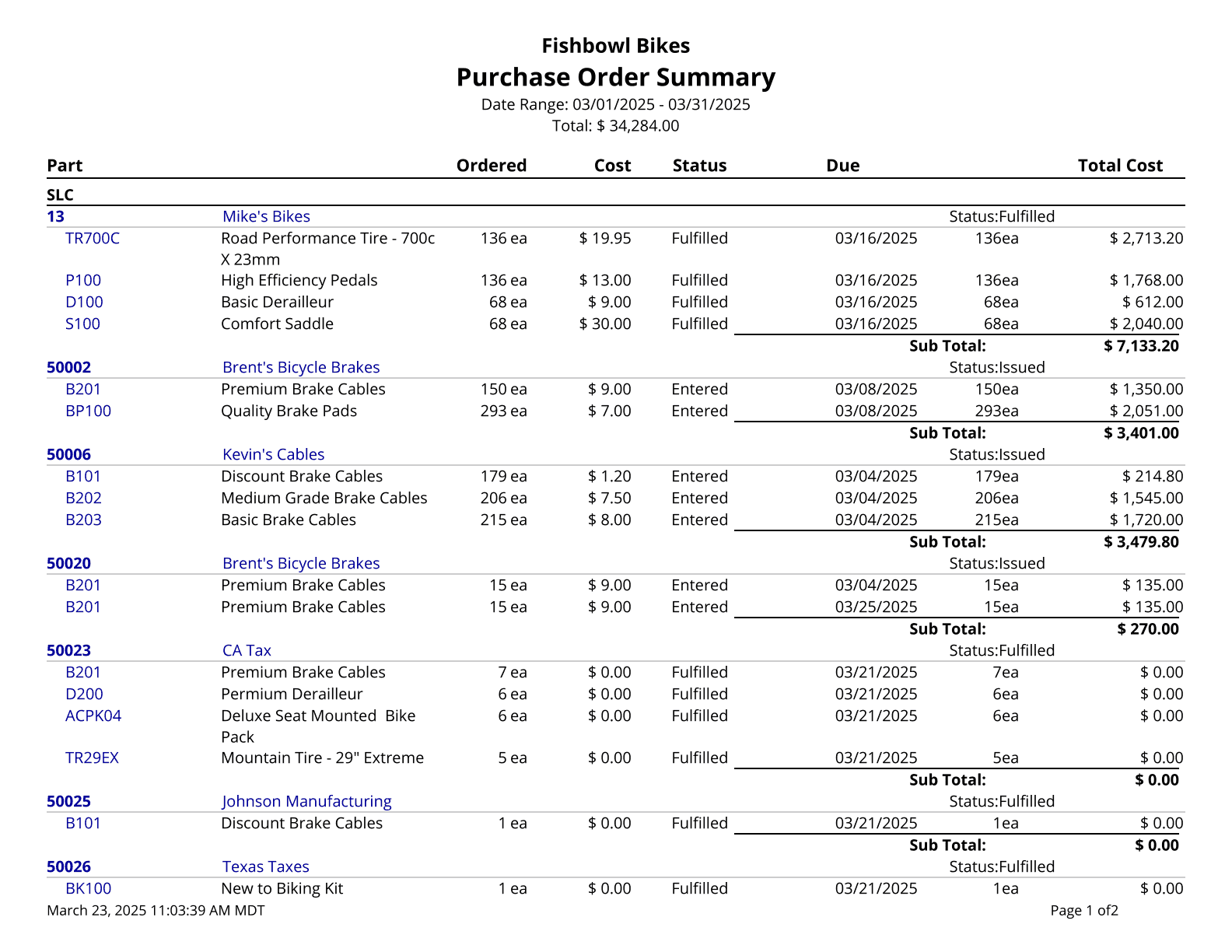 Vendor Performance Report - Gives a part-by-part list of vendor fulfillments on purchase orders received during a date range, vendor, and/or part.