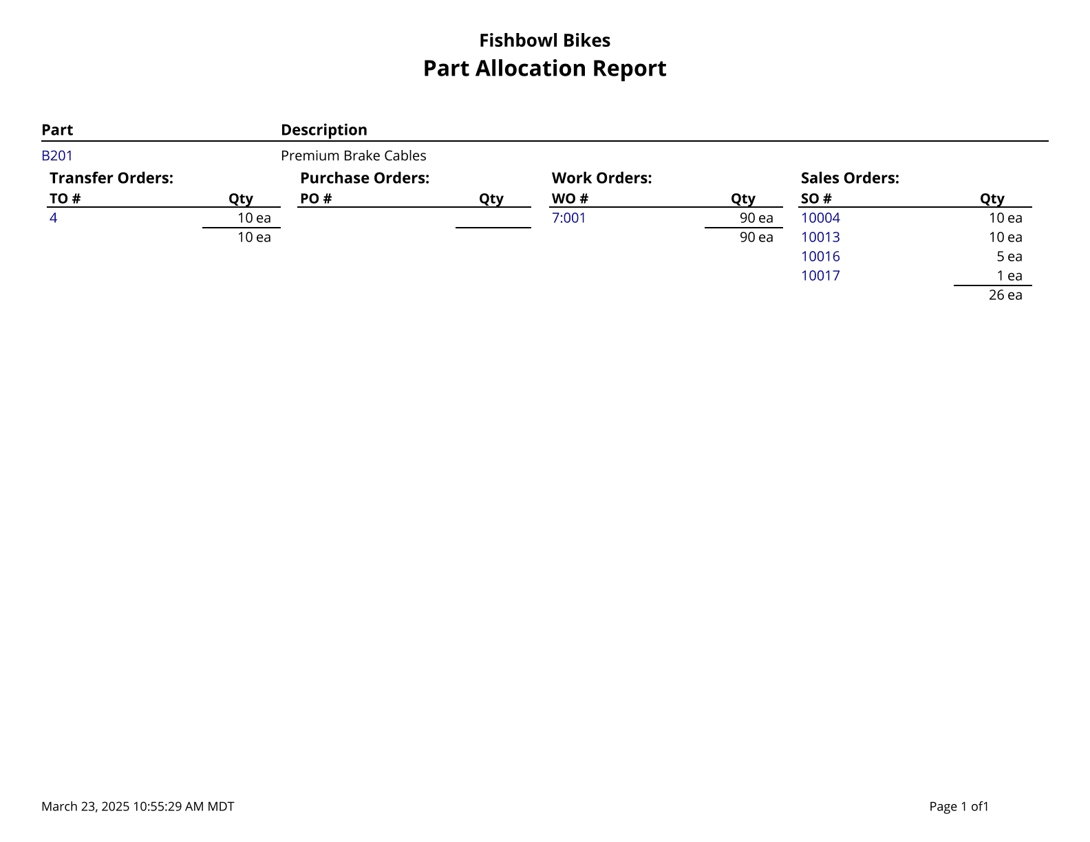 Production Demand - Shows current demand (allocated to an order) for finished goods in a given date range. It shows demand for each order and also includes a summary by Part Number helping you know exactly what needs to be produced in manufacturing.