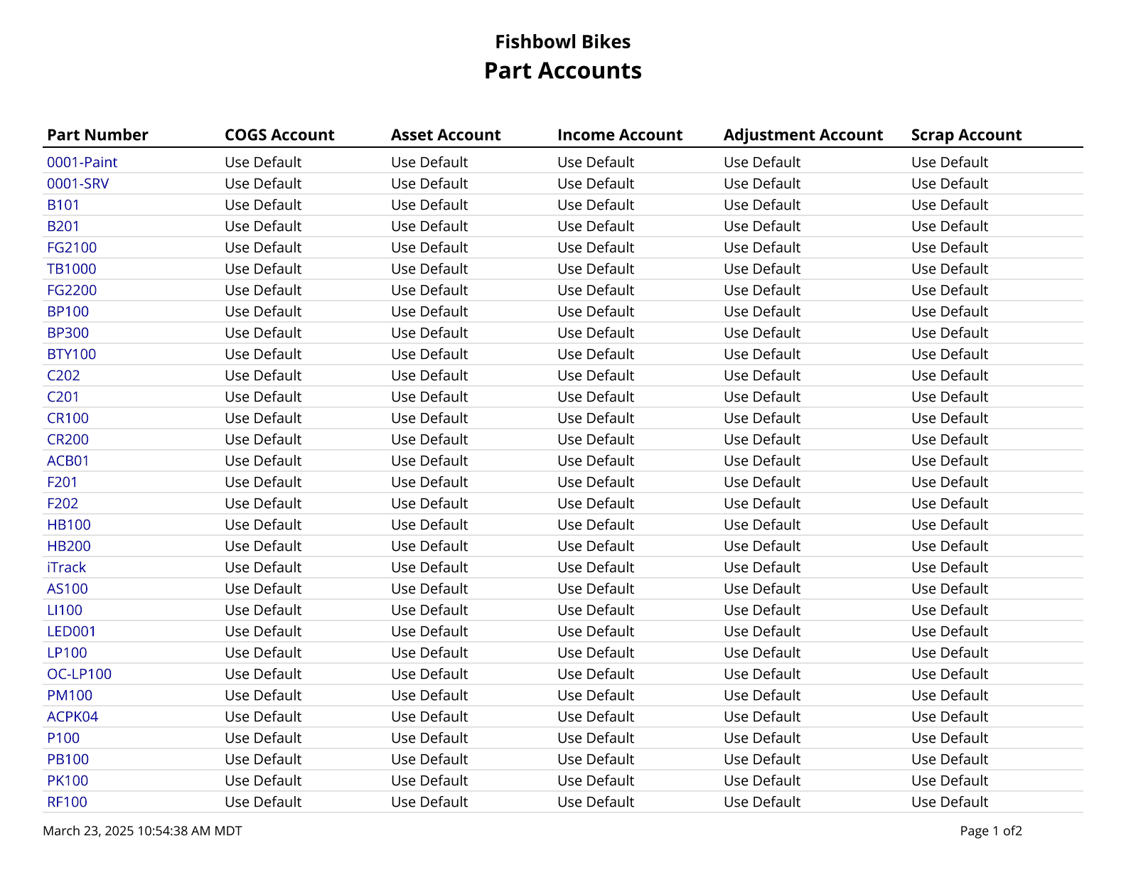 Part Accounts - Prints a list of parts and their associated accounts if they have been assigned.