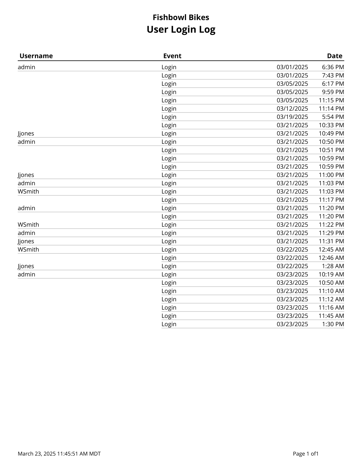 User Login Log - List of logins and logouts made be users to the Fishbowl system.