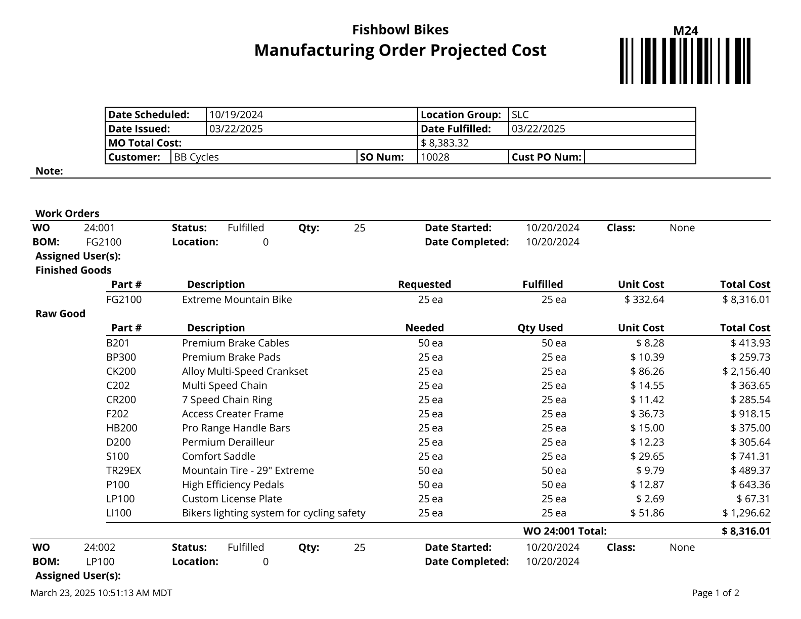 Manufacture Order Projected Cost - Displays the manufacture order cost amounts and manufacture order items. Cost of unfulfilled work orders is based on your database costing method. Fulfilled work order costs are your historical cost for the work order.