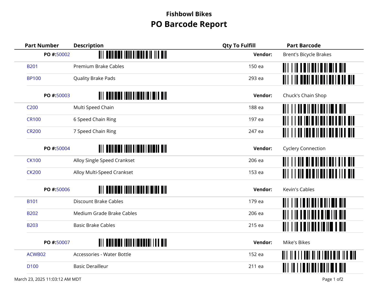 Part Barcodes By PO One Off - Prints All Product barcodes (Code 128) for a given PO. Formatted for One Off 2 x 1 labels.