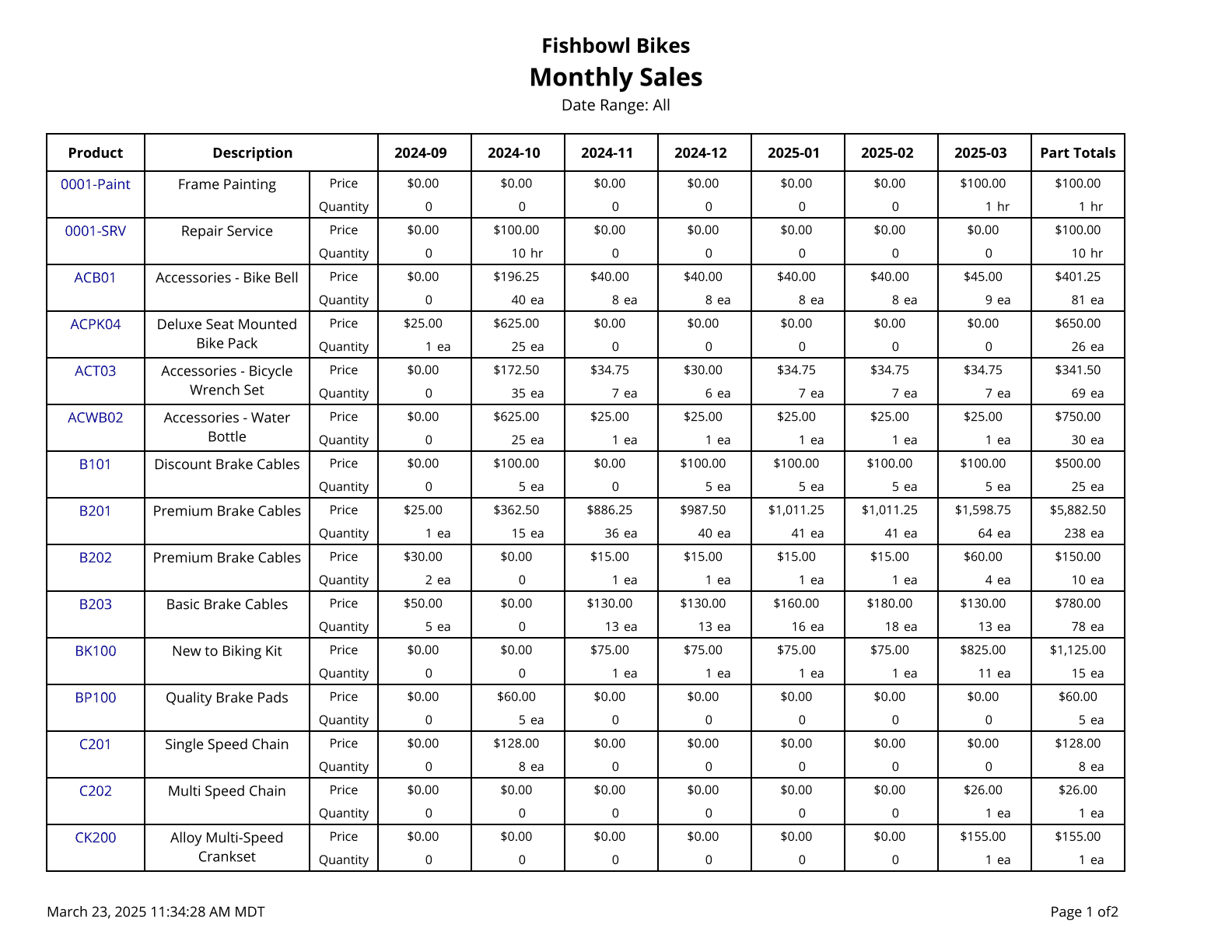 Sales By Month - Shows product sales broken out by month.