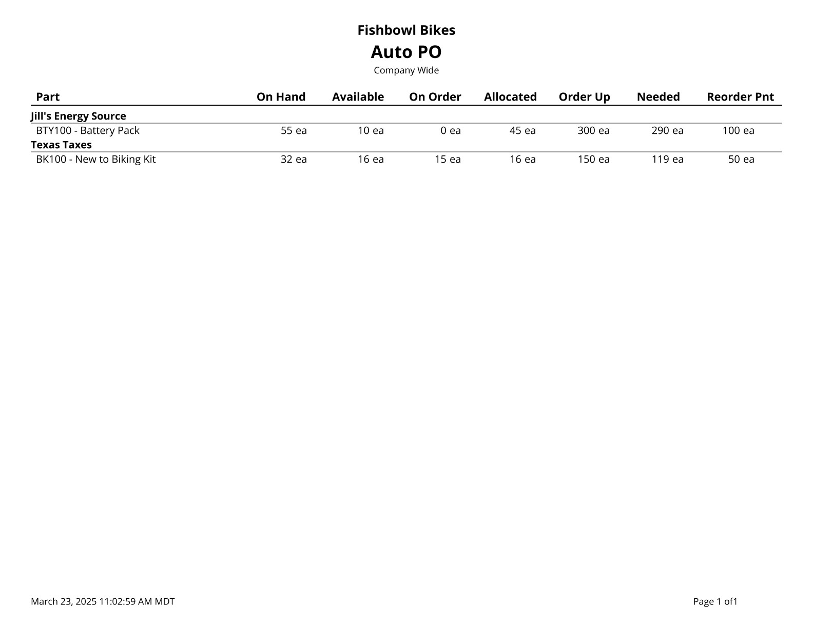 Auto PO - Prints a list of parts below reorder tolerance. This report runs the Auto-PO code and can take a few minutes to generate. Only includes parts without a default BOM or a BOM set to never auto-create.