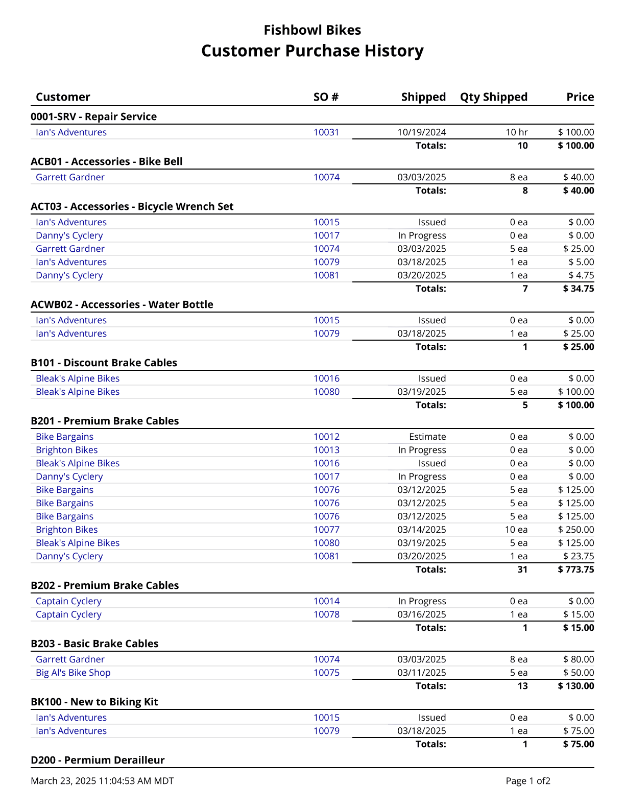Customer Statement - Prints a statement for one or more customers, showing all unpaid sales orders, payments made, and balances remaining.