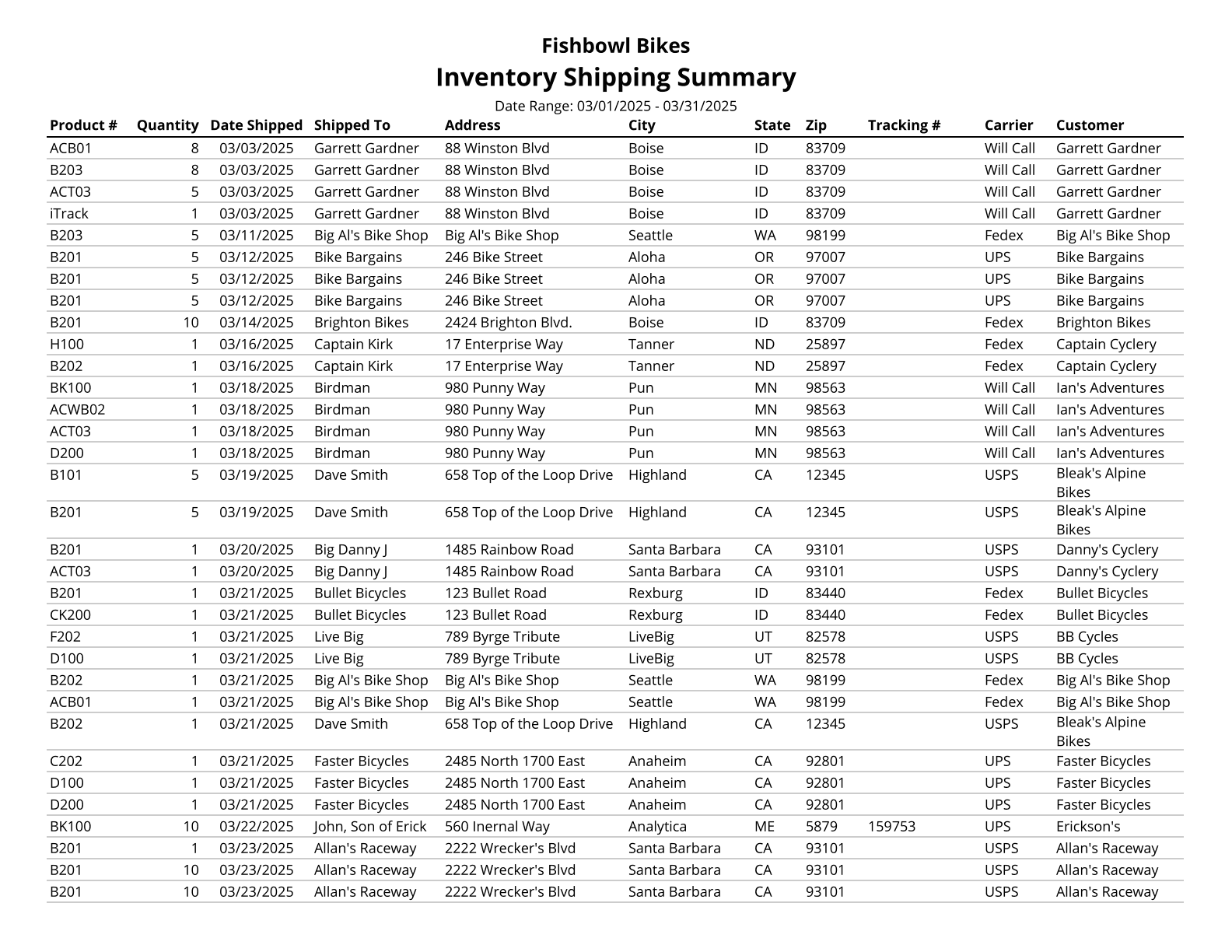 Shipment History - Prints a list of all shipments made in the specified time period.
