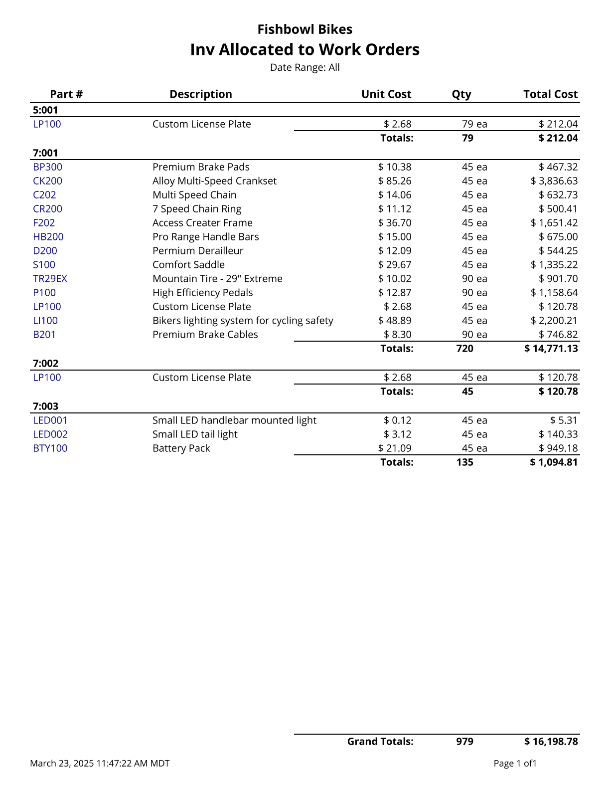Part Cost Over Time - Lists all parts and their Costs. The Average cost is calculated over the specified date range.