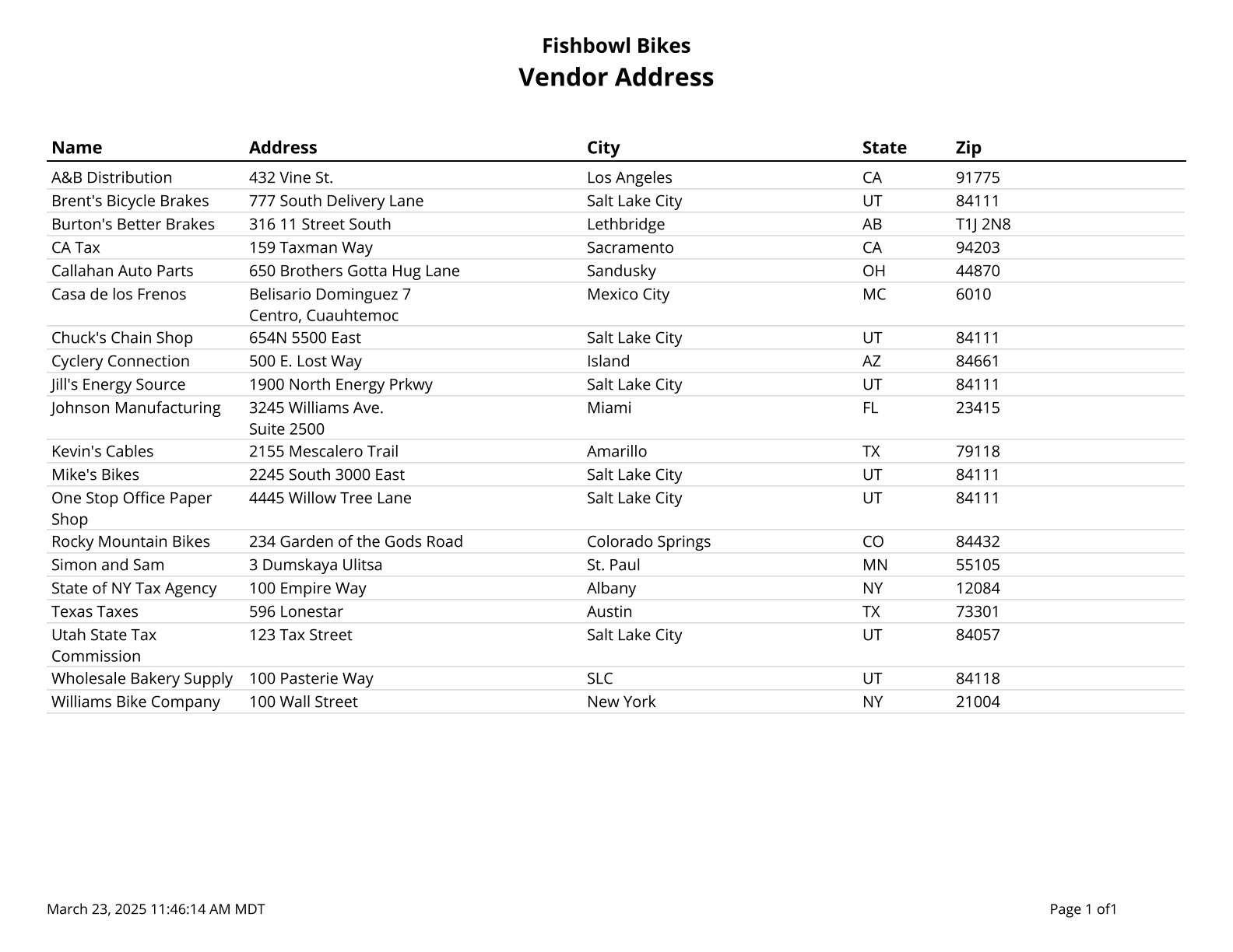 Vendor Address - A list of Vendors and Addresses.