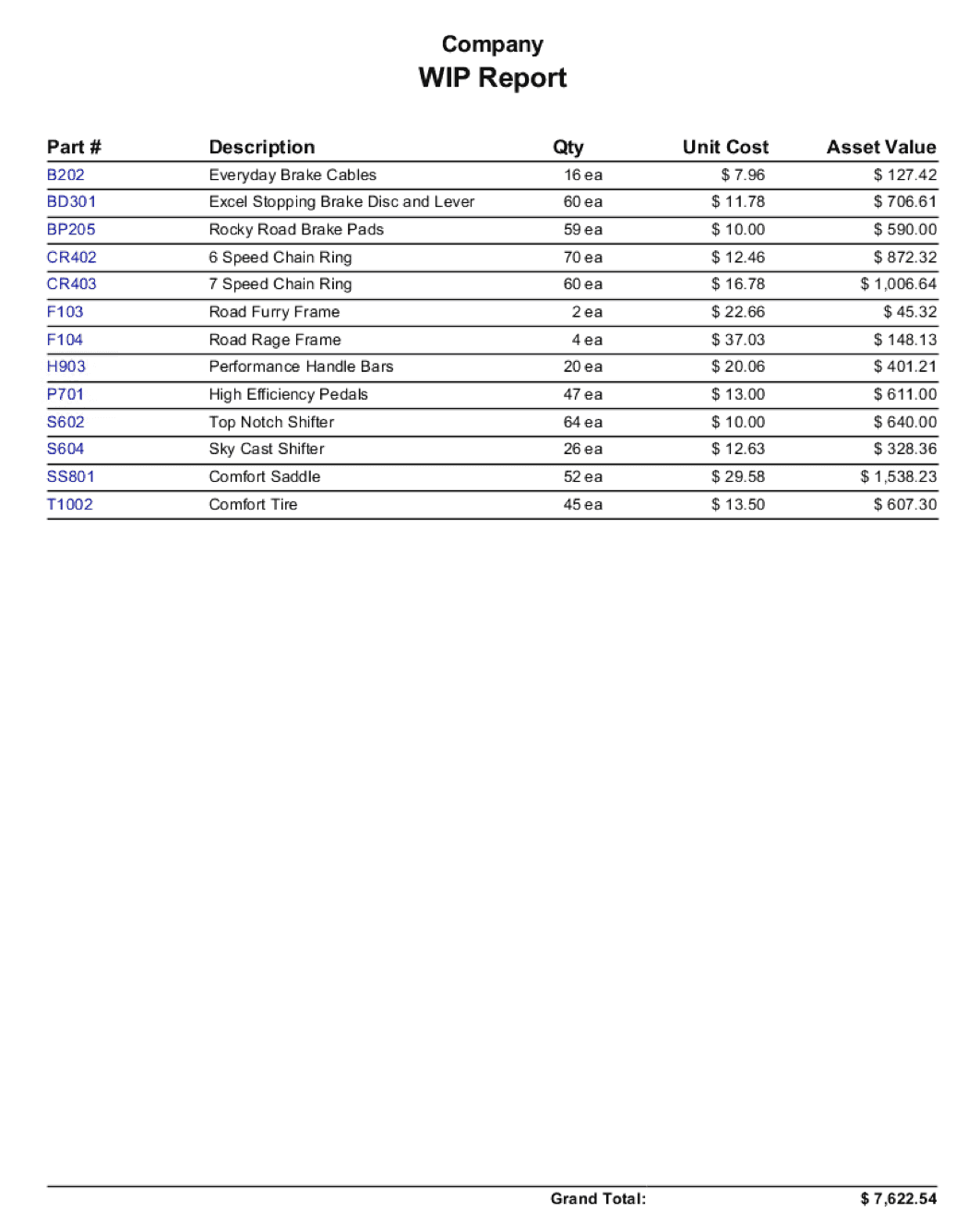 Work In Progress - Generates a WIP summary of the quantity and value of all parts currently in manufacturing locations. Cost values are based on today's costs.