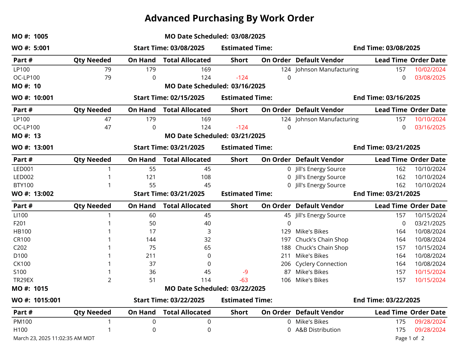 Advanced Purchasing By Work Order - Looks at the fulfillment date on a WO and then looks at the lead time on the individual BOM items. Based on the fulfillment date of the WO and the lead time of the item, the report shows you what day to place your PO.
