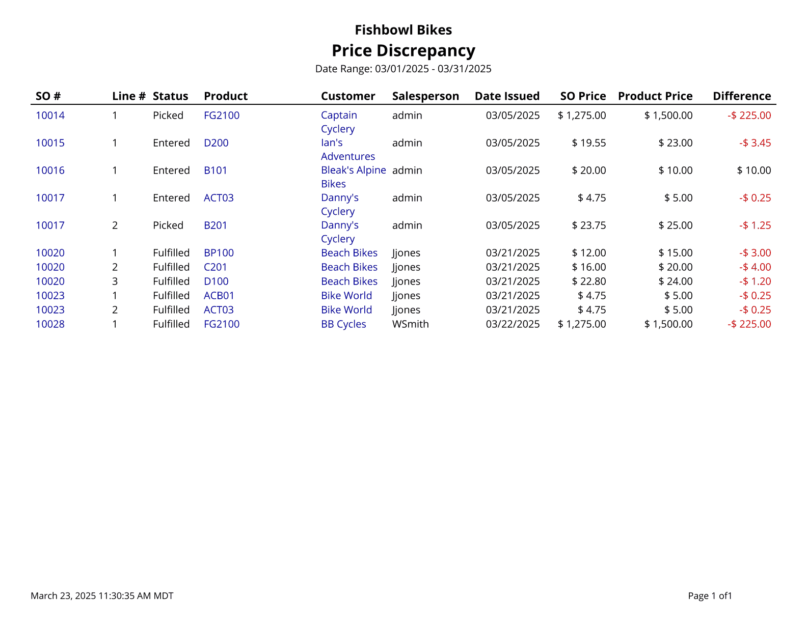 Price Discrepancy - A list of all SO Items in the system that have a price different than the list price.