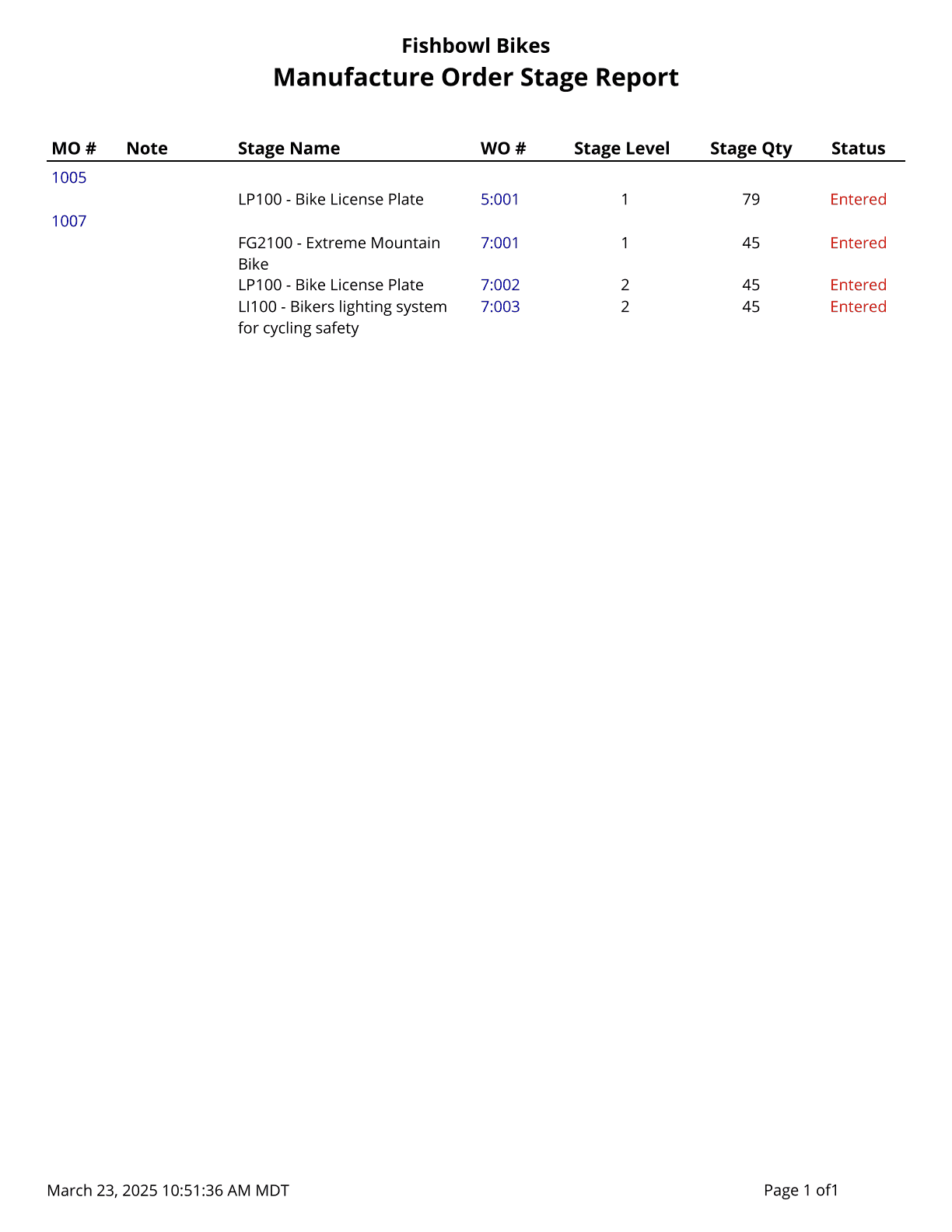 Manufacture Order Stage - Shows the various stages for open work orders. Use % for a wildcard search.