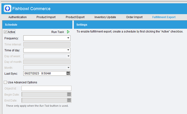 The Fulfillment Export tab in the Fishbowl Commerce plugin.