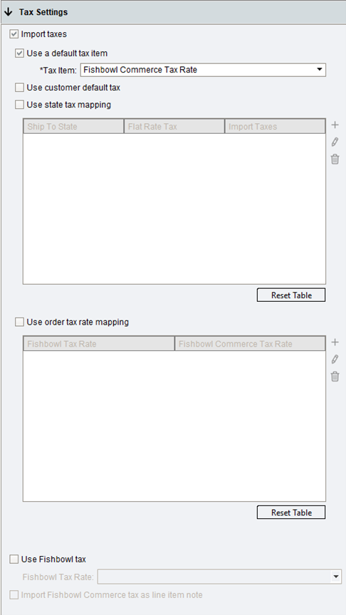 The Tax Settings section of the Order Import tab in the Fishbowl Commerce plugin.